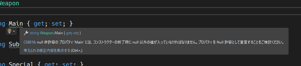 ここで、null許容参照型のプロパティの初期化を行っていないためこのような警告が出ます。初期化をしろと怒られています。